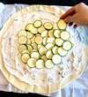 Disposez harmonieusement les courgettes sur la tarte, puis les tomates séchées coupées en petits morceaux, les tranches de chèvre et le fromage râpées.
